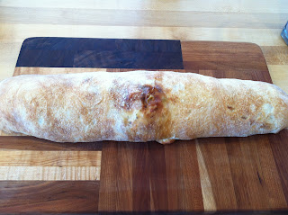 Starting farthest away from you, roll the dough in on itself forming a log. When you get to the end, pull the edges up and around nice and thin and pinch to seal. Roll the Stromboli over so it is seam side down. Tuck the ends under, making sure there is no ham or cheese sticking out (it will burn).